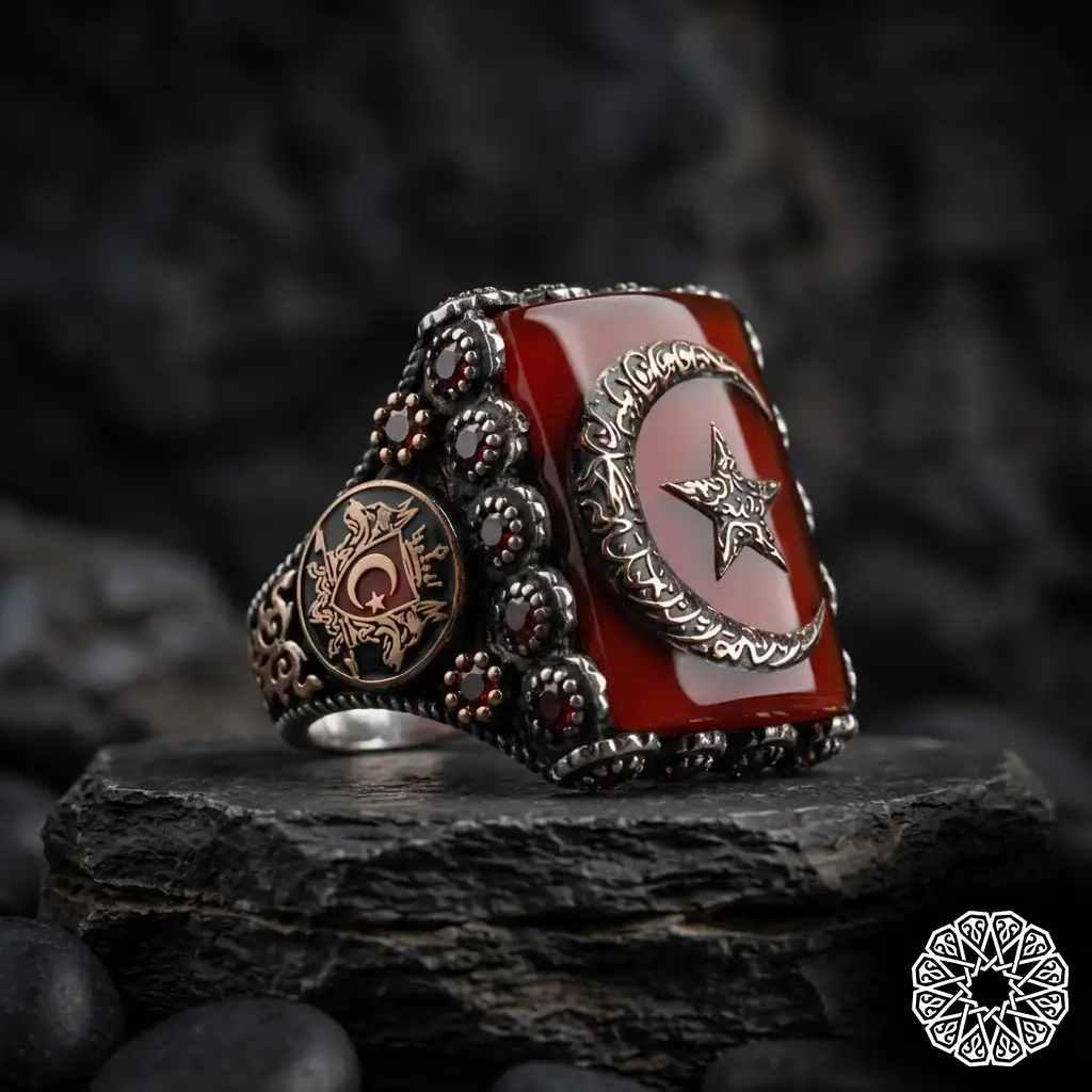 Üst kısmında kırmızı kehribar taş içinde motifli Ay-Yıldız, yanlarda ise iki kurt figürü ile güç, sadakat ve asalet tek yüzükte buluştu.